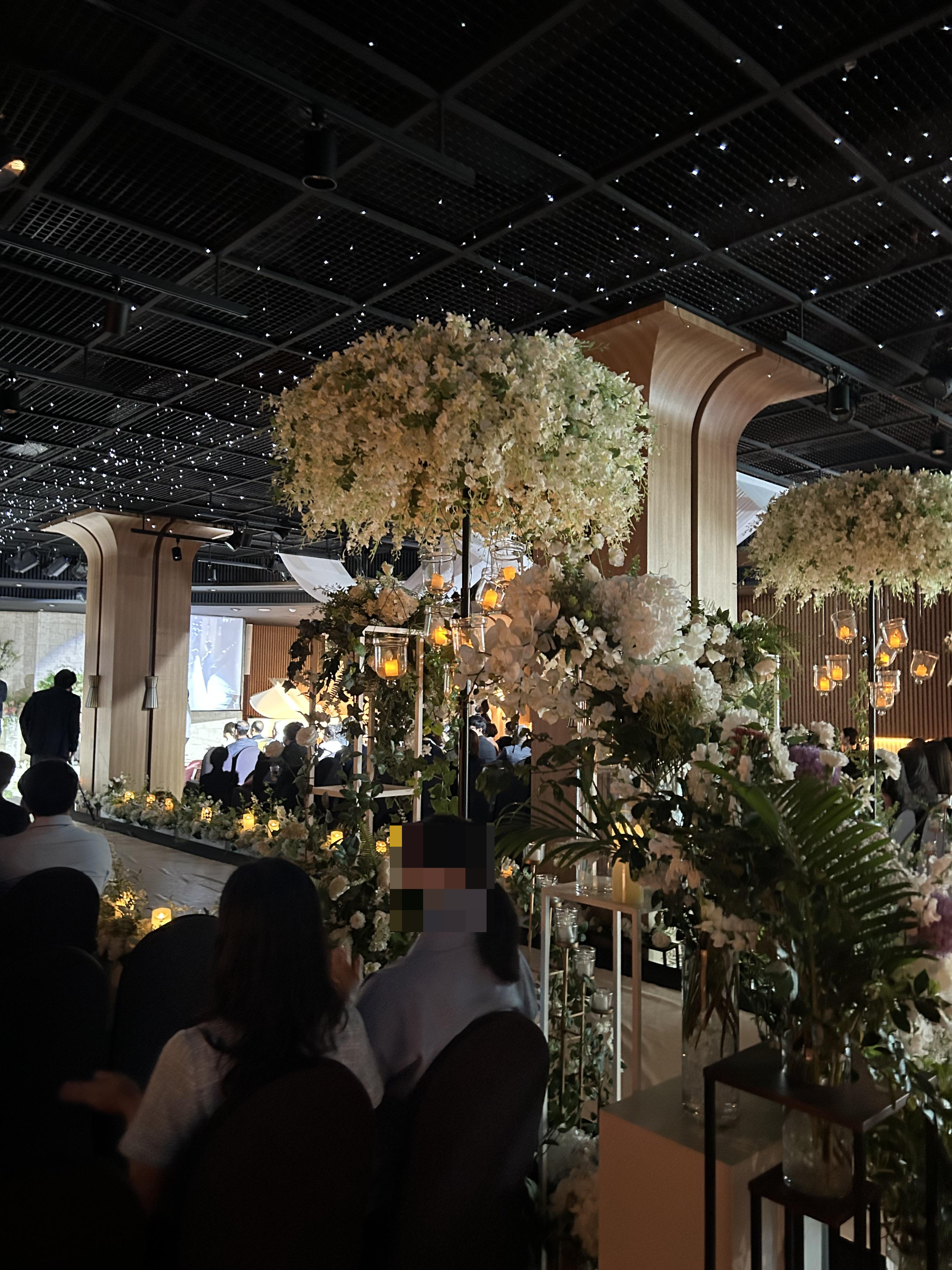 저희가 방문했을 때는 마침 예식이 진행 중이었어요. 버진 로드가 조금 짧고 층고가 낮은 편이지만, 꽃 장식은 풍성하고 예뻐서 아쉬움을 달래주었어요! 신부대기실도 넓고 쾌적해서 좋았는데, 조명이 살짝 노란빛이라 아쉬웠어요. 또한 신부대기실 뒤에 있는 꽃은 매번 달라진다고 해요. 내부에 화장실이 있어서 편리했고, 간단한 다과도 준비되어 있었답니다.